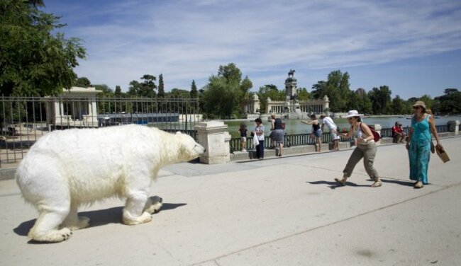 No, it’s not an out-take from an old episode of Lost; it’s actually a human-operated polar bear puppet run by Greenpeace walking around a park in Madrid to raise awareness about threats to the Arctic. (Photo: AP Photo/Alberto Di Lolli)