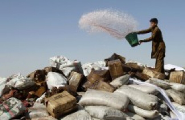 A man pours petrol over a pile of confiscated drugs and alcohol in Afghanistan Rahmat Gul/AP/Press Association Images