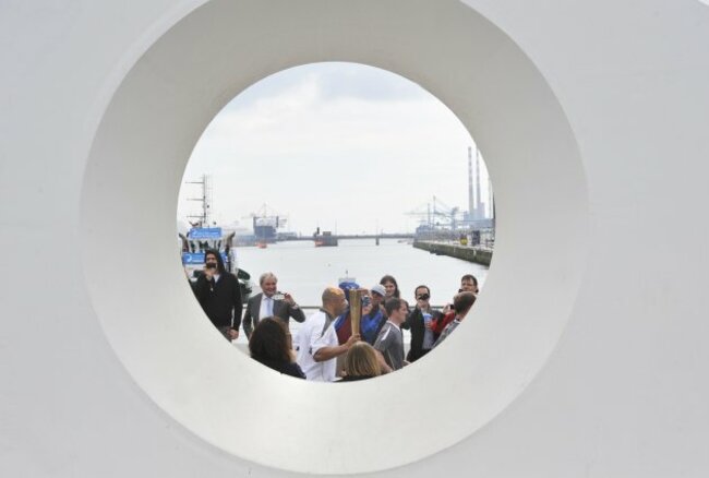 Soccer legend Paul McGrath of course, with no sign of those knees acting up as he crossed the Samuel Beckett Bridge with the torch this morning. Photo: Sasko Lazarov/Photocall Ireland