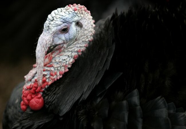 A male turkey or a ‘gobbler’ is pictured on Gerry McEvoy’s turkey farm today in Sallins, Co. Kildare preparing for the Christmas season. (Mark Stedman)