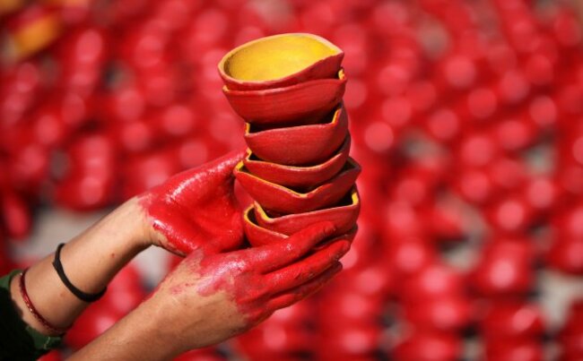 An Indian potter carries earthen lamps at a workshop ahead of the Hindu festival Diwali on the outskirts of Jammu, India, Tuesday, Nov. 6, 2012. Diwali, the festival of lights, will be celebrated on Nov. 13. (AP Photo/Channi Anand)