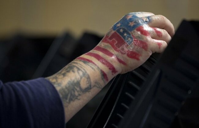 Wearing his heart on his sleeve: Victor “The Snake Mann” Wolder shows off his new tattoo as he votes on Election Day, Tuesday, Nov. 6, 2012, in Las Vegas. Wonder which candidate he’s rooting for… (AP Photo/Julie Jacobson)