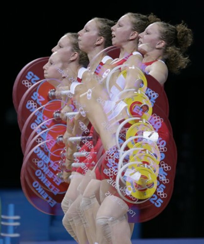 In this multiple exposure photo, Annie Moniqui of Canada competes during the women’s 58-kg, group B, weightlifting competition at the 2012 Summer Olympics, Monday, July 30, 2012, in London. (AP Photo/Hassan Ammar)