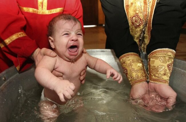 One of 920 babes is baptised during a mass baptism ceremony in the Holy Trinity Cathedral in Tbilisi, Georgia. (Image: Shakh Aivazov/AP/Press Association Images)