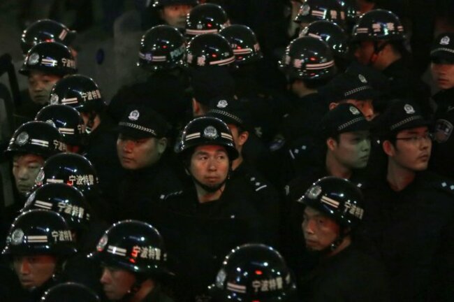 Chinese anti-riot police men gather outside the city government office in Zhejiang province’s Ningbo city, where residents had gathered to protest the proposed expansion of a petrochemical factory Sunday, Oct. 28, 2012. (AP Photo/Ng Han Guan)