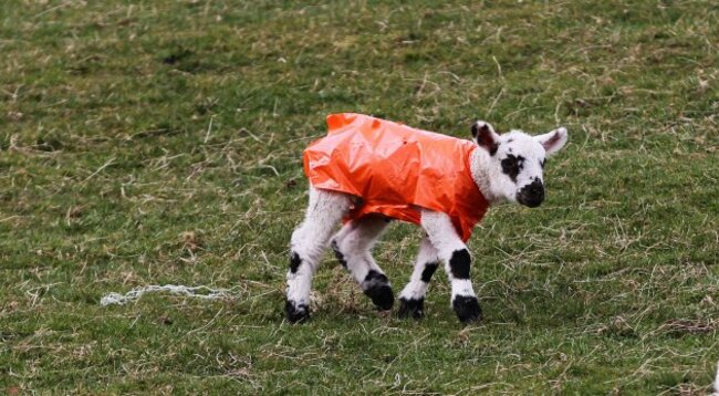 Farmers have put little ‘jackets’ on lambs in the fields around Langley, Cheshire to help them with the unusually cold weather conditions during the lambing season. (Image: Lynne Cameron/PA Wire)