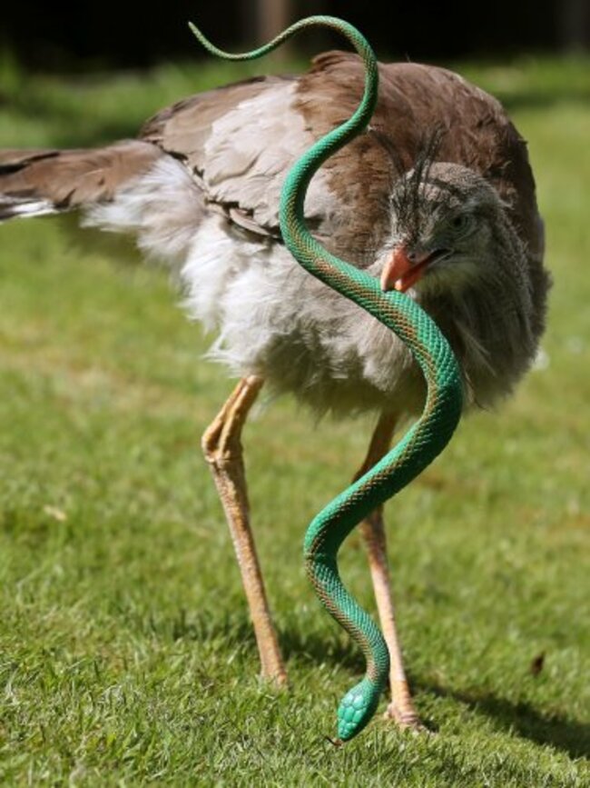 Phoenix, the Red legged Seriema with a rubber snake at Blair Drummond Safari Park in Stirling. (Andrew Milligan/PA Wire)