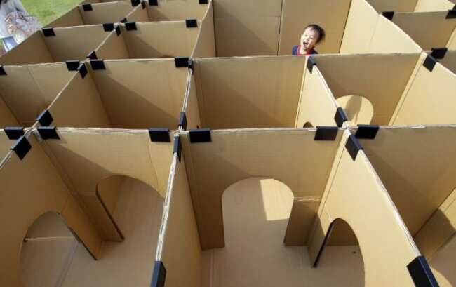 A child makes his way in a maze made from cardboard boxes at a park in Tokyo, Sunday, May 26, 2013. (AP Photo/Shizuo Kambayashi)