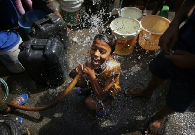 A young Indian boy cools himself off with water being distributed by the municipality in a local slum on a hot summer day in New Delhi, India. (Kevin Frayer/AP)