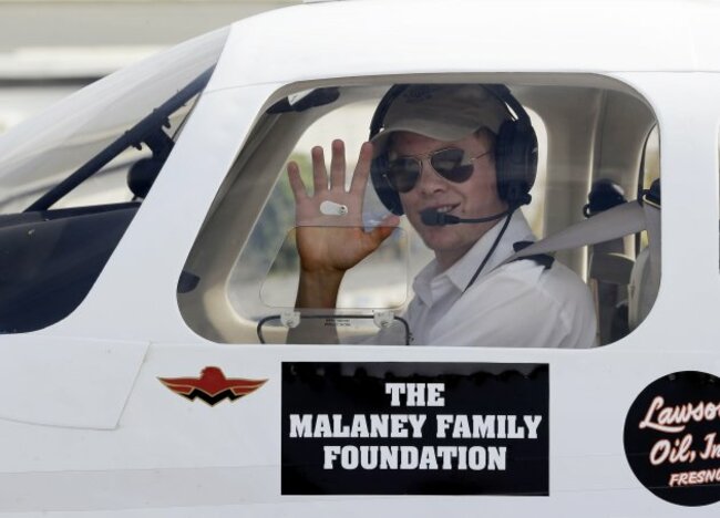 Californian Jack Wiegand waves from the cockpit of his Mooney M20 single-engine plane prior to taking off for Kobe, Japan, in the next leg of his attempt to be the youngest pilot to fly around the world. Wiegand, 20, has flown across North America, the Atlantic, Europe, the Middle East and South Asia. (AP Photo/Bullit Marquez)
