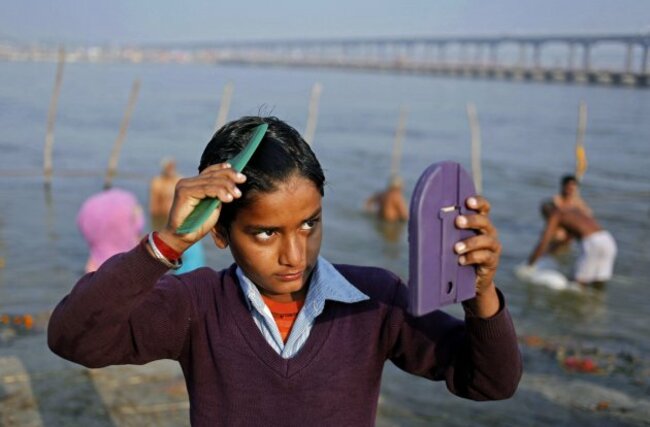 A young Indian Hindu devotee combs his hair after a dip at the Sangam, the confluence of the Ganges, Yamuna and mythical Saraswati River, during the Maha Kumbh festival in Allahabad, India, Thursday, Feb. 21, 2013. Millions of Hindu pilgrims have been attending the Maha Kumbh festival, which is one of the world’s largest religious gatherings that lasts 55 days and falls every 12 years. (AP Photo/ Rajesh Kumar Singh)