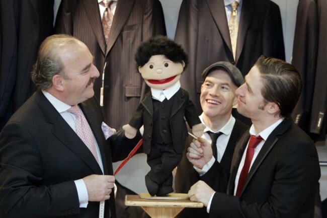 Adrian Copeland, left, measures up 2ft Tiny Tim who will be among the stars of ‘A Christmas Carol’ to be performed at The Ark in Temple Bar on 1, 8, 15 and 22 Dec for ages 8 plus. This adaptation will mark the 200th anniversary of Charles Dickens’ birth, performed by Aaron Monaghan, right, and Bryan Burroughs with a very special puppet playing Tiny Tim, who will be kitted out in a bespoke tailored suit made by Adrian Copeland of the renowned Louis Copeland and Sons. www.ark.ie. Photo: Mark Stedman/Photocall Ireland