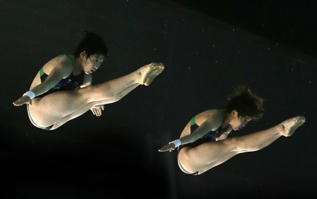 Yiying Xing and Wenna Wang of China dive during the women’s synchronized 10-metre platform final, in Dubai, United Arab Emirates. The Chinese team won a gold medal. (AP Photo/Hassan Ammar)