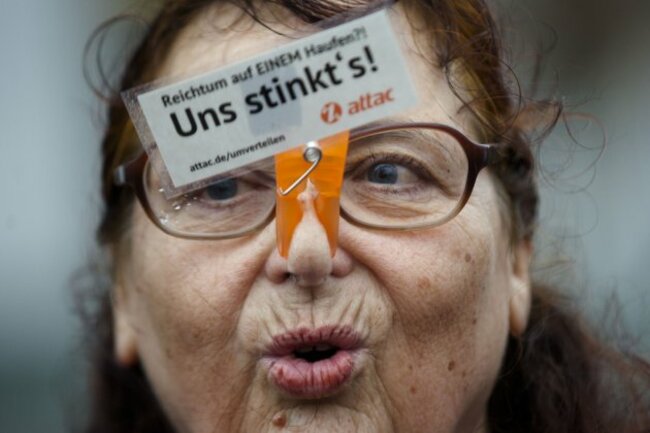 An activist of the organisation atttac has a clothes-pin on her nose with the slogan ‘Wealth on ONE pile? We are cheesed off!’ during a demonstration against the money policy of Germany and Europe in Berlin. (AP Photo/Markus Schreiber)