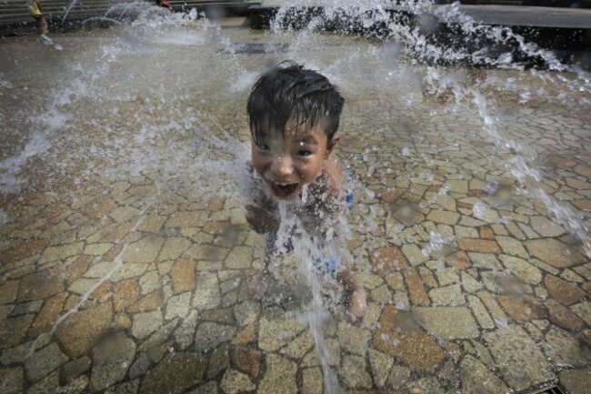 A boy plays in a fountain to beat the heat at a Tokyo park Saturday, July 6, 2013. (AP Photo/Itsuo Inouye)