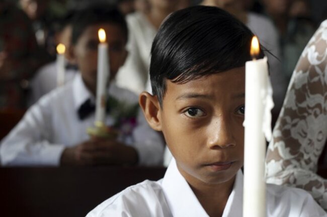 Boys hold candles during a mass for receiving the first communion at catholic church in Nusa Dua, Bali, Indonesia on Sunday, June 2, 2013. Indonesia’s president has accepted a statesmanship award on May 30, 2013 from a US interfaith foundation that says it hopes to encourage him to promote freedom of worship and tolerance in the world’s most populous Muslim-majority nation. (AP Photo/Firdia Lisnawati)