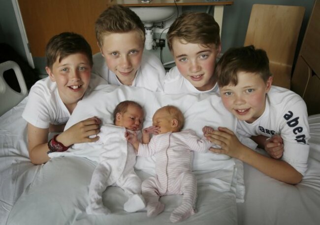(Below) More baby news: newborn twins Isla Rodger (left) and Rowan Rodger (right), who defied the odds by becoming the third set for twins to be born by the same mother, are picture with their brothers left to right Finn, Kyle, Lewis and Jude at the Southern General Hospital in Glasgow. (Danny Lawson/PA)