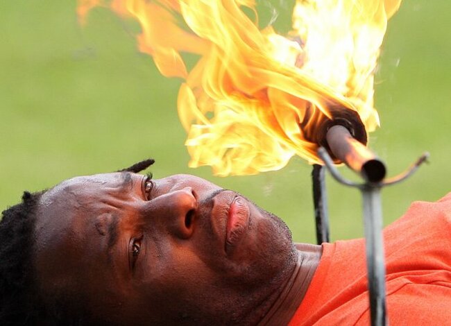 Woah! We wouldn’t fancy getting that close to fire, but this performer taking part in limbo dancing at the clash of the Celtic Giants at Glenarm Castle knows what he is doing. The event is part of the Dalriada Festival in Larne.