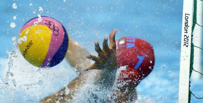 Italy goalkeeper Stefano Tempesti attempts a save during a training session at the Water Polo Arena at the 2012 Summer Olympics, Saturday, July 28, 2012, in London. (AP Photo/Julio Cortez)
