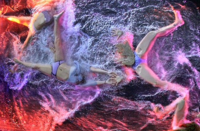 Dancers from the Argentinian group Fuerzabruta, perform their act entitled “Mylar” in a translucent pool suspended overhead in Singapore during the Night Festival which showcases international arts performances in the city-state. (AP Photo/Wong Maye-E)