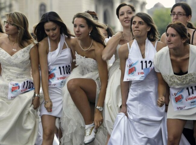 Brides prepare for a race in central Belgrade, Serbia, Sunday, July 22, 2012. The winner and two runners-up of the Bridal Race, organised by a local magazine, receive numerous awards, including the wedding gown they had chosen to race in. (AP Photo/Darko Vojinovic)