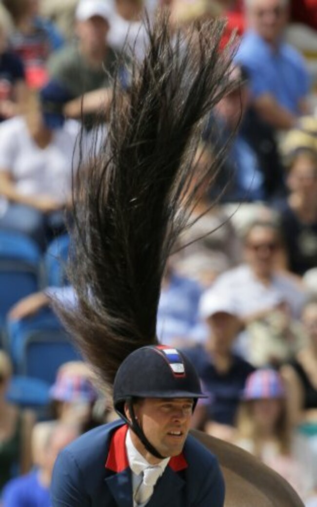 Simon Delestre of France rides his horse Napoli Du Ry in the equestrian individual jumping competition, at the 2012 Summer Olympics, Wednesday, Aug. 8, 2012, in London. (AP Photo/ Dmitry Lovetsky)