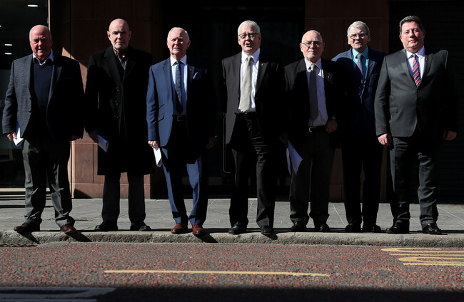 Seven of the Hooded Men, who were kept in hoods interned in Northern Ireland in 1971, (from left) Jim Auld, Patrick McNally, Liam Shannon, Francie McGuigan, Davy Rodgers, Brian Turley and Joe Clarke, following a press conference at KRW Law in Belfast. PA Wire/PA Images