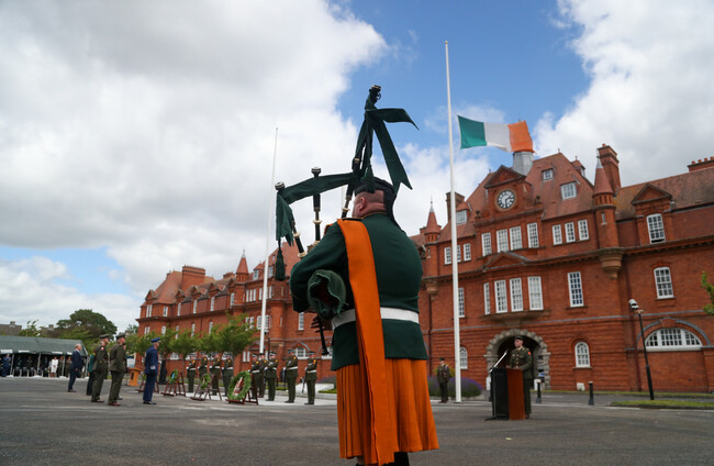 A military piper stands on parade at McKee Barracks. Irish Defence Forces
