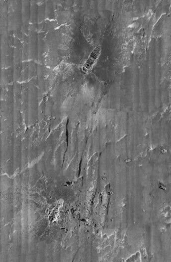 This composite image shows zig-zag marks on the ocean floor which indicate how the debris settled as if the ship had spun down through the water rather than descending in a straight line as was previously thought. (AP Photo/RMS Titanic Inc.)