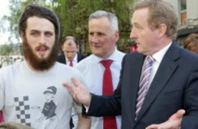 Enda Kenny talks to Jack O'Donnell from Dundalk (left) during a canvass in the town this week. Laura Hutton/Photocall Ireland