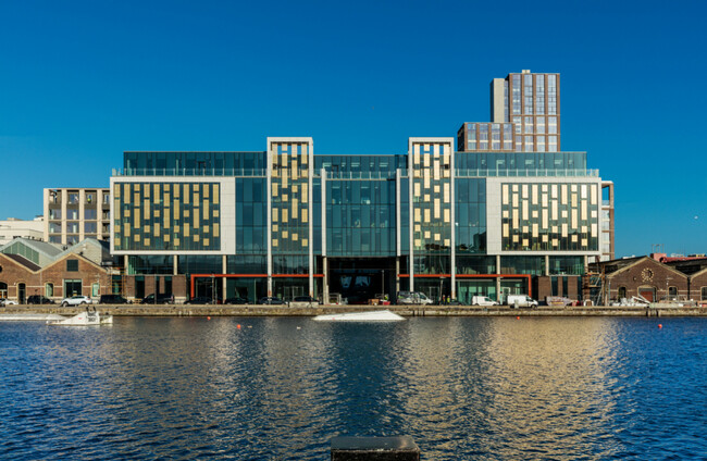 Real estate firm Savills is jointly handling the sale and says the building has “impressive water frontage spanning almost 75 meters” on Hanover Quay.