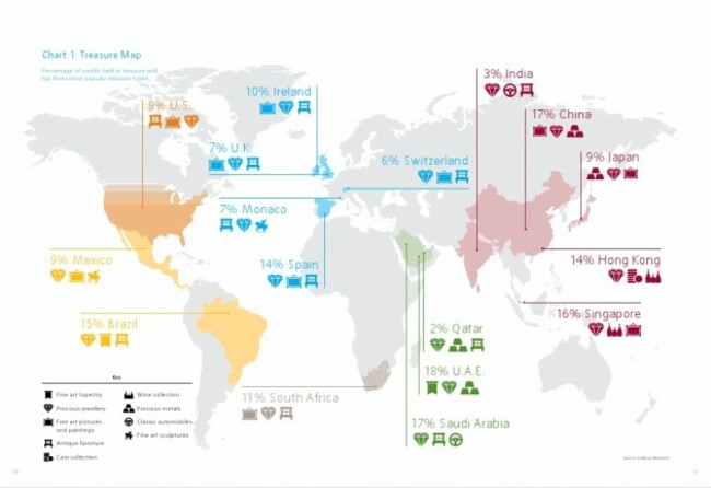 The figures for Ireland are in line with the global average but some countries show a much greater desire for treasure. In the United Arab Emirates, for one, the average treasure chest is about 18 per cent of a rich person’s wealth.