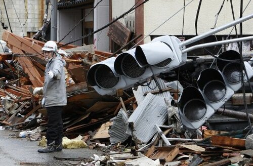 A construction worker controls the traffic at a devastated area in Kesennuma, northern Japan, while traffic lights destroyed by the tsunami lie behind him. (AP Photo/Shizuo Kambayashi)