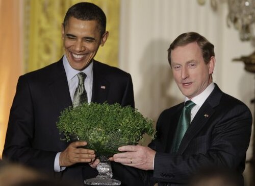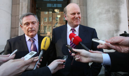 Minister for Public Expenditure and Reform Brendan Howlin looks pensive as Finance Minister Michael Noonan reports on their talks with IMF officials in Dublin on Wednesday. Pic:Niall Carson/PA Wire.