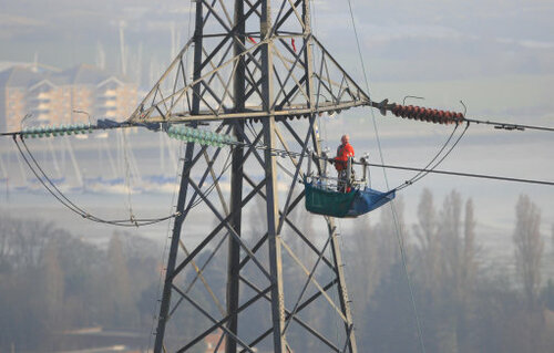 A lone engineer works in a gondola attached to high voltage power lines high above the ground in Hampshire, England. Pic:Chris Ison/PA Wire