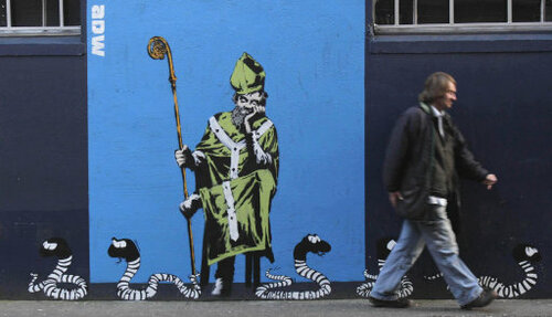 The artist known as ADW leaves his mark on a Dublin city wall. It depicts snakes of a particularly modern species - corruption, white collar crooks, gangland and, er, Michael Flatley - sneaking past a sleeping St Patrick. Pic: Niall Carson/PA Images.