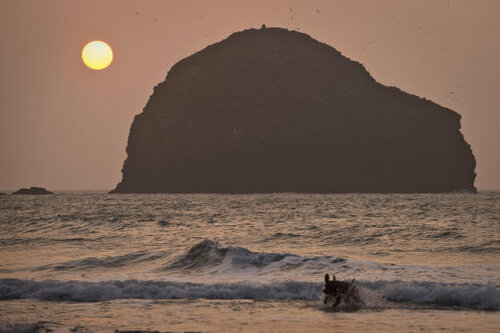 A dog splashes in the surf as the sun sets in front of Gull Rock off the coast of Cornwall. Pic: Ben Birchall/PA Images.