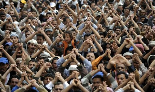 Anti-government protestors demand the resignation of Yemeni President Ali Abdullah Saleh, in Sanaa, Yemen. (AP Photo/Hani Mohammed)