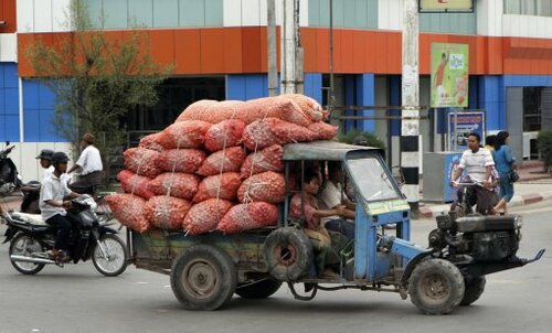 Vendors carry bags of onions on an extraordinary-looking modified truck to sell at a local bazaar in Mandalay in central Myanmar. (AP Photo/Khin Maung Win)