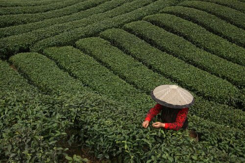 A farmer pick green tea leaves in Pujiang county in China's Sichuan province ahead of the traditional spring tea trading markets.(Photo By Zheng Duo/Color China Photo/AP Images)