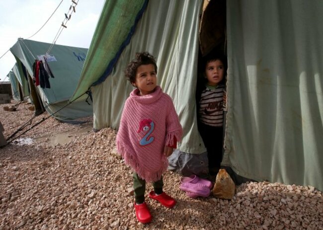 Syrian refugee children stand outside their tent, at a temporary refugee camp in the eastern Lebanese town of Marj near the border. (Image: Hussein Malla/AP/Press Association Images)
