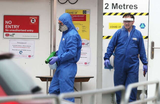 Workers from an industrial cleaning company using an electrostatic sprayer for deep cleaning at the Grangegorman East Quad construction site which closed temporarily after a worker tested positive for Covid-19 earlier this week. PA