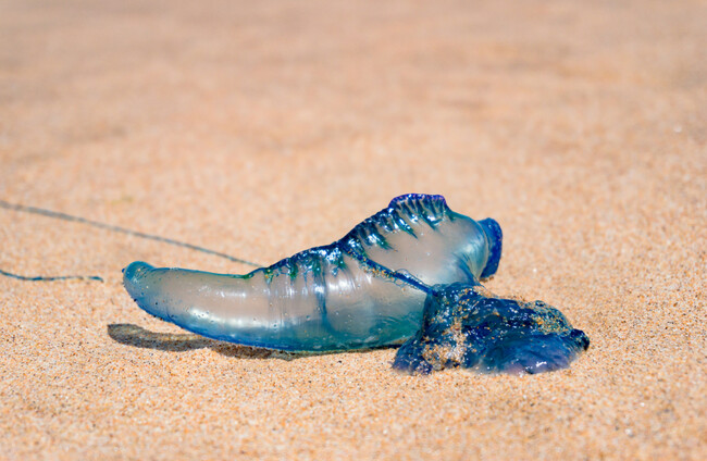shutterstock_746079637 (1) High angle view of bluebottle stingers washed up on beach in New South Wales, Australia. Shutterstock / Natalie Board Shutterstock / Natalie Board / Natalie Board