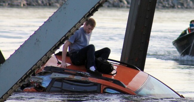 In this photo provided by Francisco Rodriguez, Bryce Kenning sits atop his car that fell into the Skagit River after the collapse of the Interstate 5 bridge there minutes earlier. (AP Photo/Francisco Rodriguez)