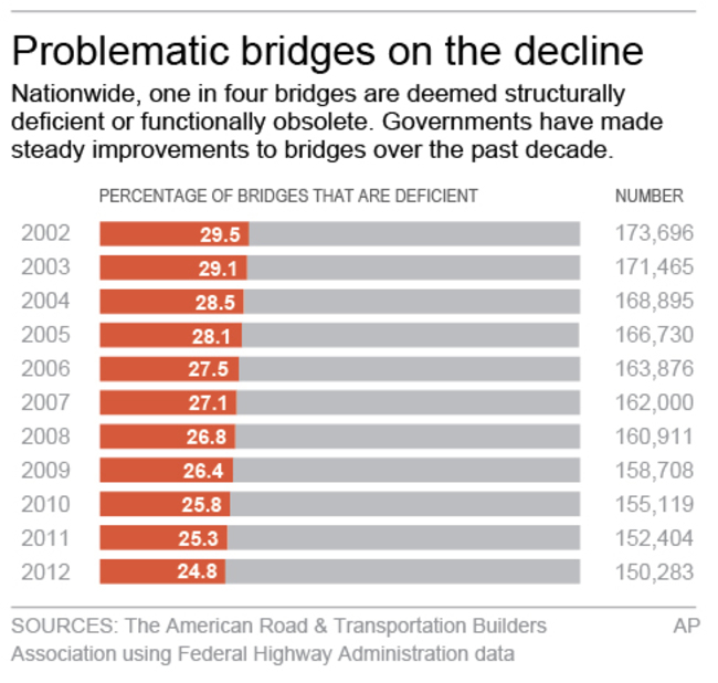 There are 66,749 structurally deficient bridges and 84,748 functionally obsolete bridges in the US, including Puerto Rico, according to the Federal Highway Administration. That’s about a quarter of the 607,000 total bridges nationally. States and cities have been whittling down that backlog, but slowly. In 2002, about 30 percent of bridges fell into one of those two categories.