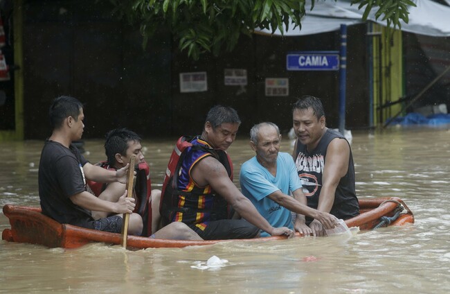 Residents ride a boat as they evacuate from their flooded homes in Marikina, Philippines Aaron Favila