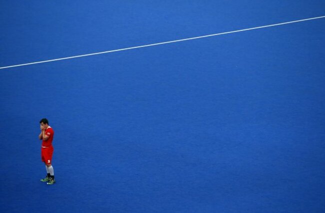 Britain’s James Tindall reacts after a men’s hockey bronze medal match Against Australia at the 2012 Summer Olympics. Australia won the match. (AP Photo/Jae C. Hong)