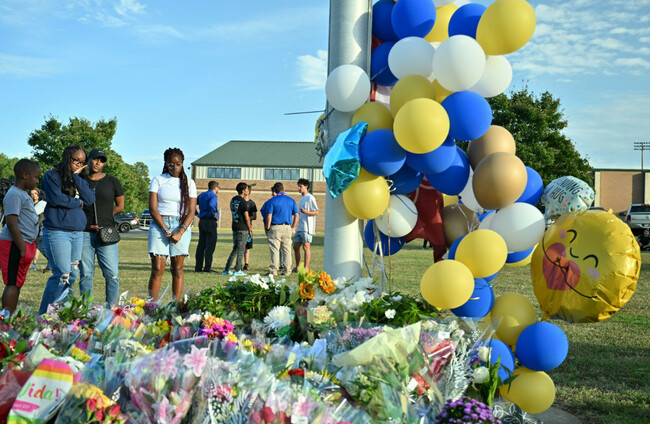 People gather to lay flowers and pray in front of the growing memorial at Apalachee High School. Alamy Stock Photo