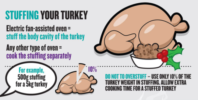 • Don’t overstuff your bird – use only 10% of the weight of the bird in stuffing. For instance, a 5kg turkey should have no more than 500g of stuffing.