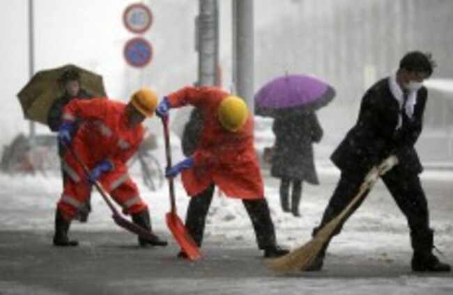 Railway station workers shove snow from the street in Yokohama, Japan. Eugene Hoshiko/AP/PA